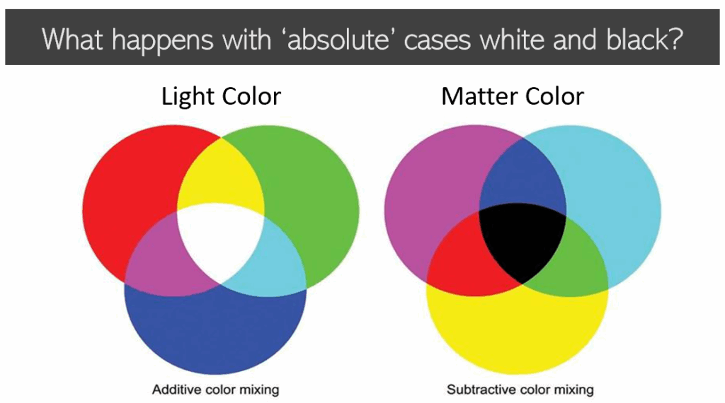 The oil looks black from without, but it is potentially white from within, as it contains all colors of light inside. We could establish an additional reference frame by saying that oil is potentially white from the inside (if the observer is inside the object). Paper looks white from without, though it is potentially black from within, as it lacks all colors of light. It is potentially black from the inside of the paper (if the observer is inside the paper). Potentially black and black differ in their dynamics; the first is going from the inside out (from the object to the observer), while the dynamics of the second is going from the outside in (from the observer to the object). It seems to me that the reference can be set arbitrarily for the first case, and the other cases must be assigned in accordance with the first. The critical factor is the consistency in the reference system, showing the existence of a gradient, a flow, a sense.