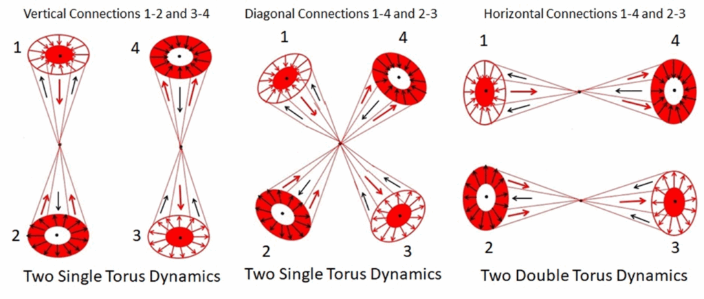 – Connecting the reference frames from the tetrahedral diagram, one obtains currents or flows that are confined in a region of space. These are feedback-feed-forward loops of information flow, that circulate back and forth to a center, building the notion of ‘an observer’, which is also an irreducible representation of information exchange. By Inés Urdaneta, Paris, France (2004).