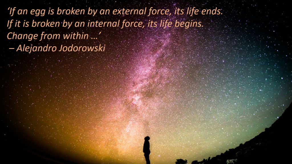 By developing an individual self-perspective in awareness of its connection to the collective perspective, we empower ourselves to construct our own, honest personal inner technology, such that we are less fearful and more confident in ourselves and the universe we live in, to become responsible co-creators of our reality. The acknowledgement of our inner nature and how it is connected to the outer world increases empathy, emotional well-being and mental health in the individual and therefore, in the collective. Healthy individuation starts understanding our boundary conditions (mental, emotional, physical and spiritual) beyond any theoretical or cultural, collective construct, diving into a grounded, poetical, personal embodiment. One must recognize our own biases and conditioning, to transcend them and grow inwardly.